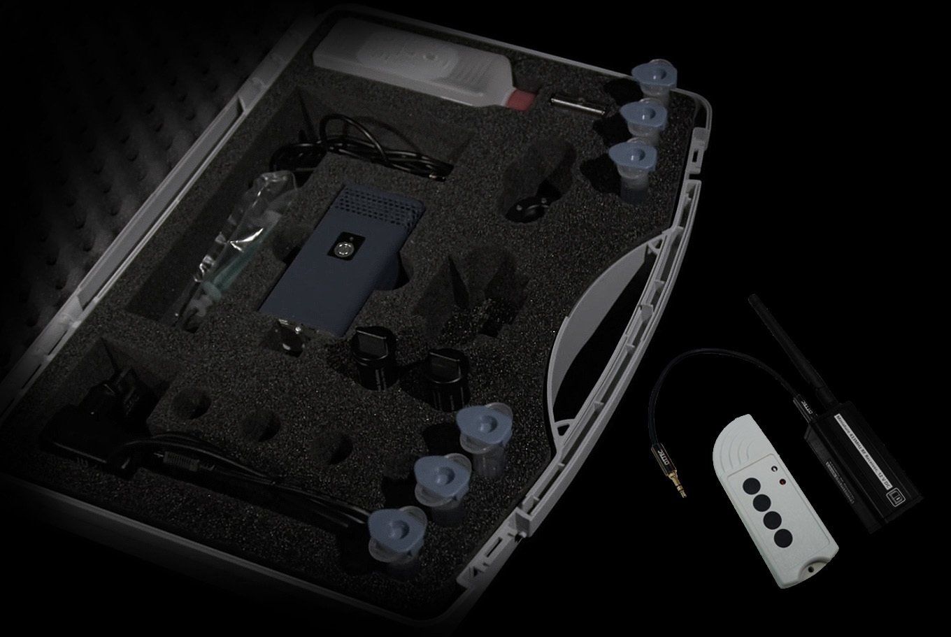 With a footprint of little more than a smartphone, the device is completely self-contained, with manual or wireless remote operation. Totally integrated battery and fog liquid cartridges with Radio frequency RX/TX remote control